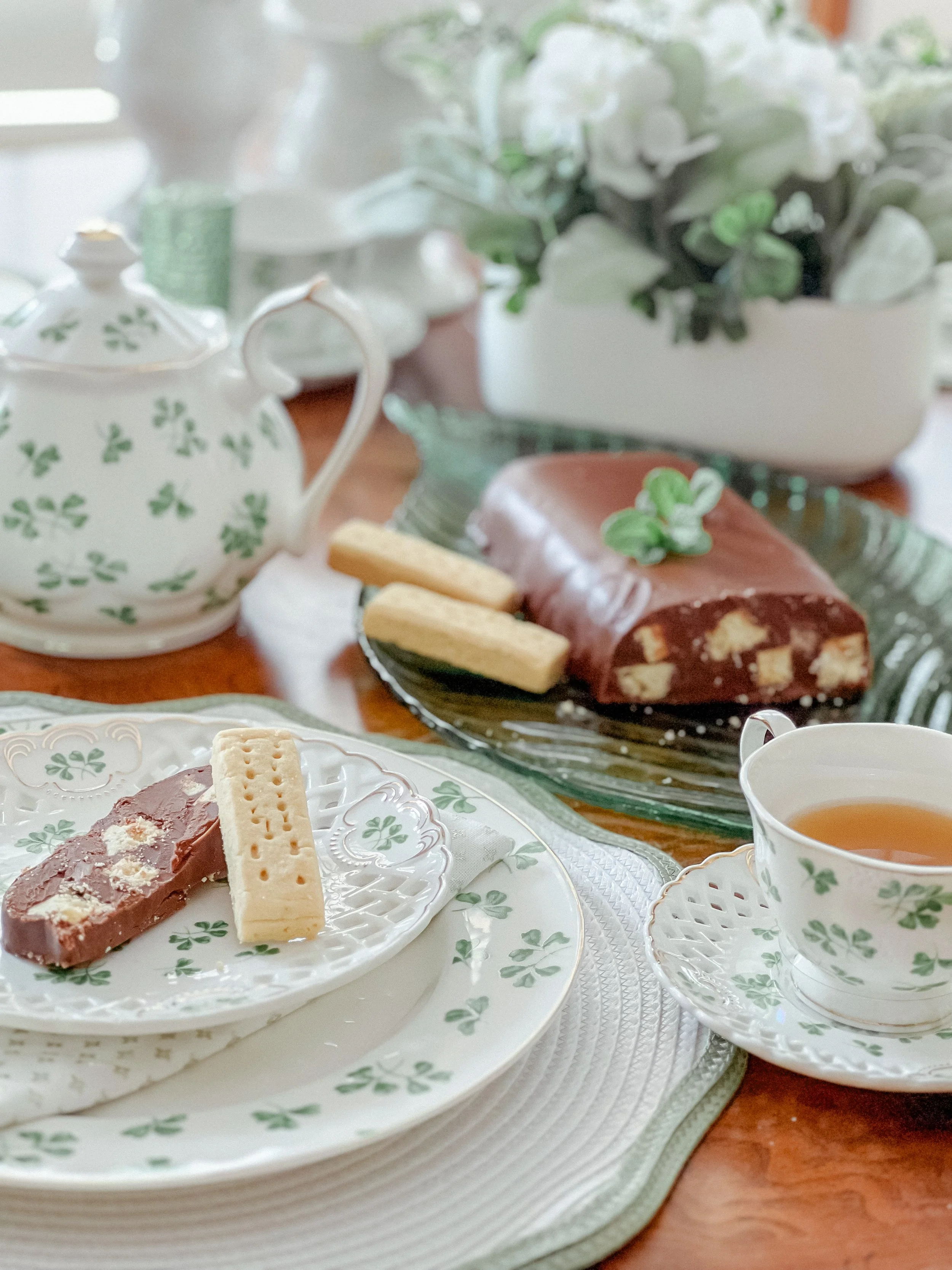 This cake is rich, chocolatey, and meant to be enjoyed one small, thin slice at a time. Studded with crunchy shortbread pieces and a touch of caramel, it’s the perfect little sweet bite for a tea table — simple, indulgent, and just enough to savor alongside a warm cup of tea. You probably will not even need sugar in your tea!